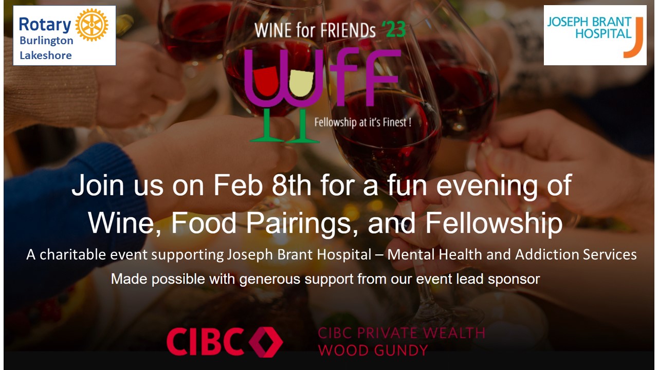 The Rotary Club of Burlington Lakeshore and CIBC Personal Wealth are pleased to present Wine-for-Friends 2023; a social evening of fine wines, food, and fellowship in support of the Joseph Brant Hospital Foundation. This community awareness and fundraising event will take place on February 8th 2023 from 5:00pm to 8:00pm at the Art Gallery of Burlington. There will be silent and live auctions. One hundred percent of proceeds will be donated to the Mental Health and Addiction Services Redevelopment and Expansion Project at Joseph Brant Hospital. Five of Ontario top wineries will provide the perfect pairings for gourmet small plates prepared by Pepperwood Bistro. Open to All. Tickets are a bargain at $55.00 per person. Quantities are limited.