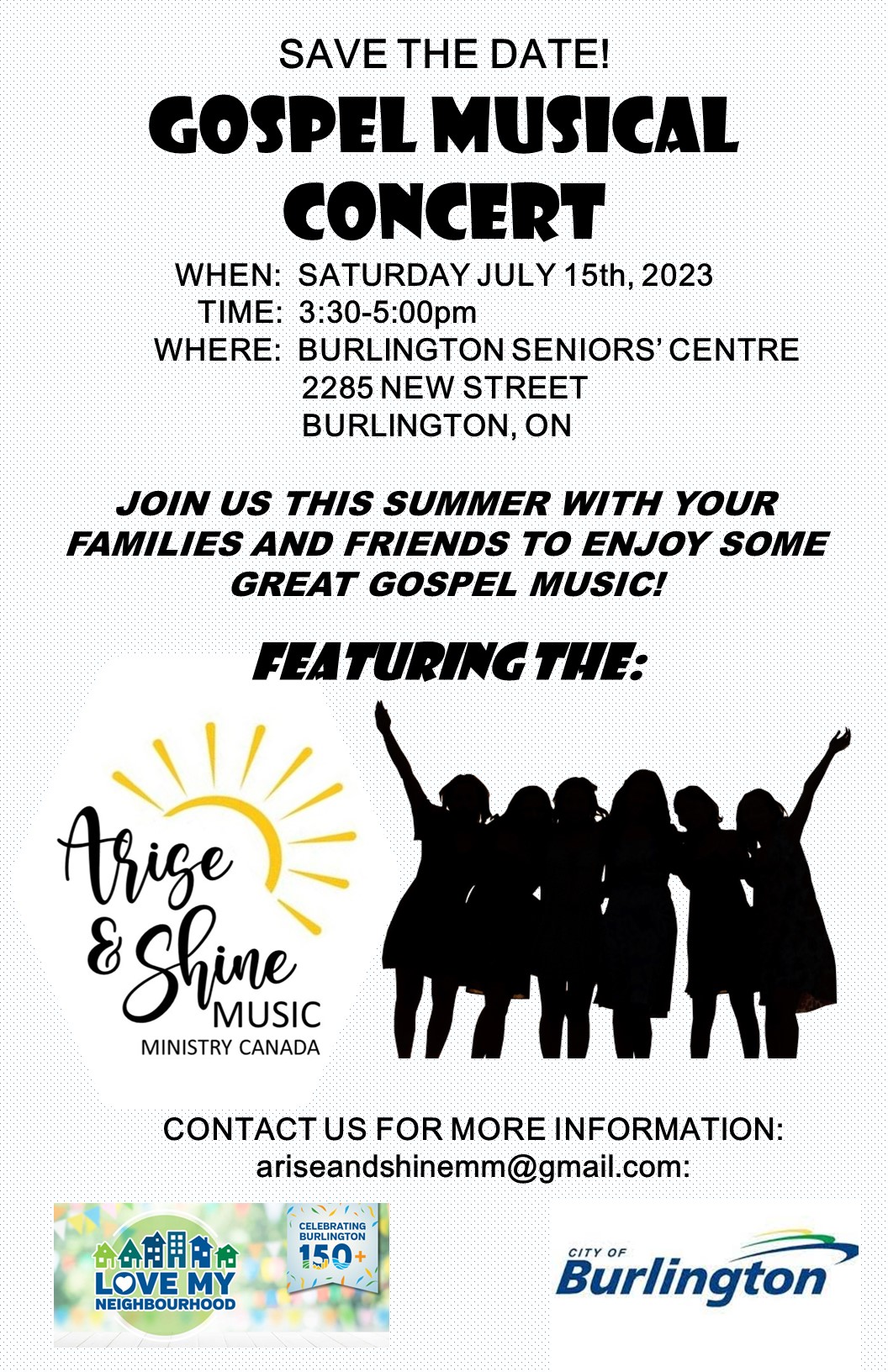 Join us this Summer with your family and friends to enjoy some great Gospel music featuring the Arise and Shine Music Ministry-CANADA!