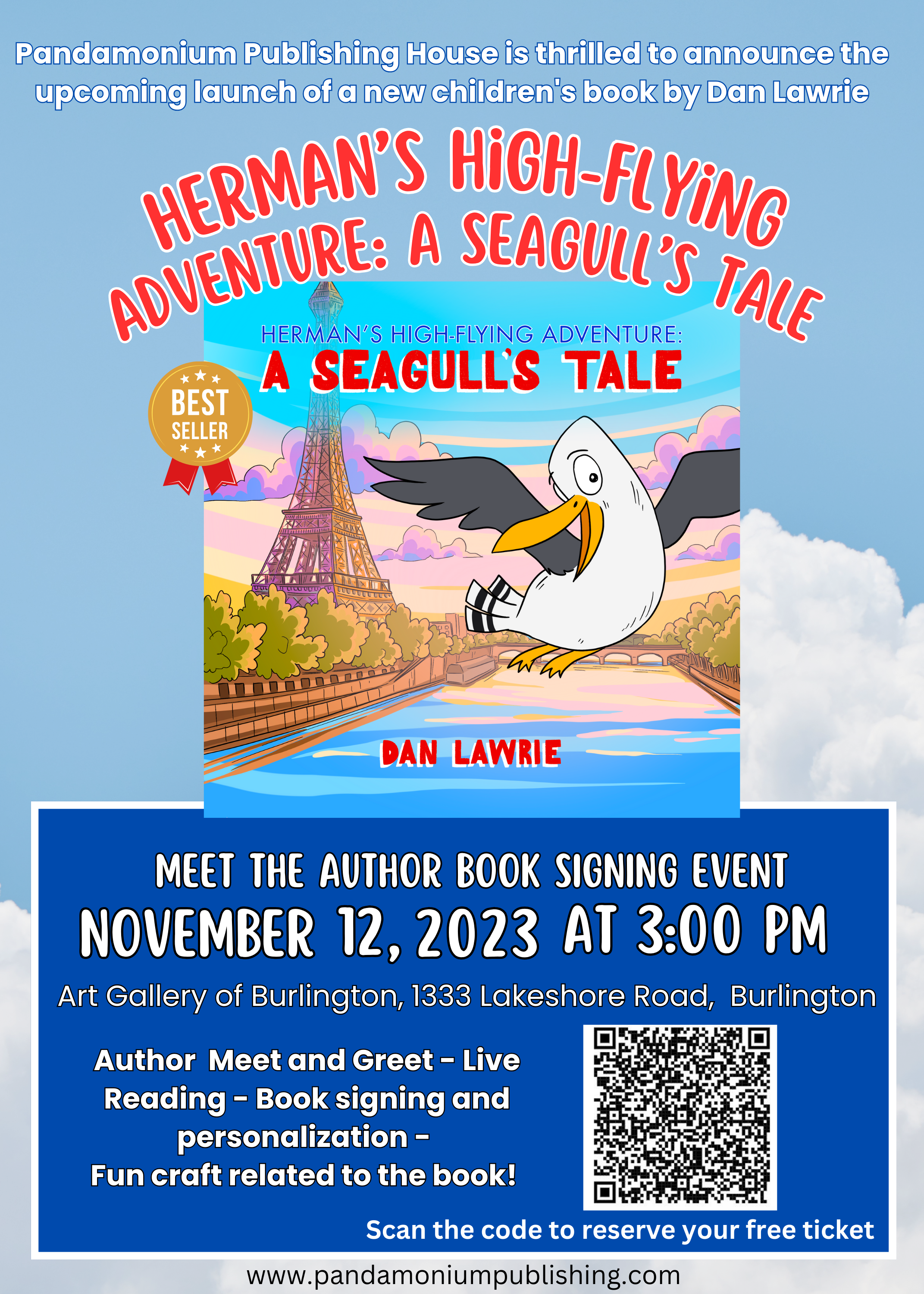 Pandamonium Publishing House with the Art Gallery of Burlington is thrilled to announce the upcoming launch of a new children's book by Dan Lawrie! At this free event, you can meet the author and listen to him read his best-selling book titled, Herman's High-Flying Adventure: A Seagull's Tale. Plus, there will be a fun craft related to the book! The event is free, get your free tickets at Eventbrite. November 12, 2023 3:00 PM.