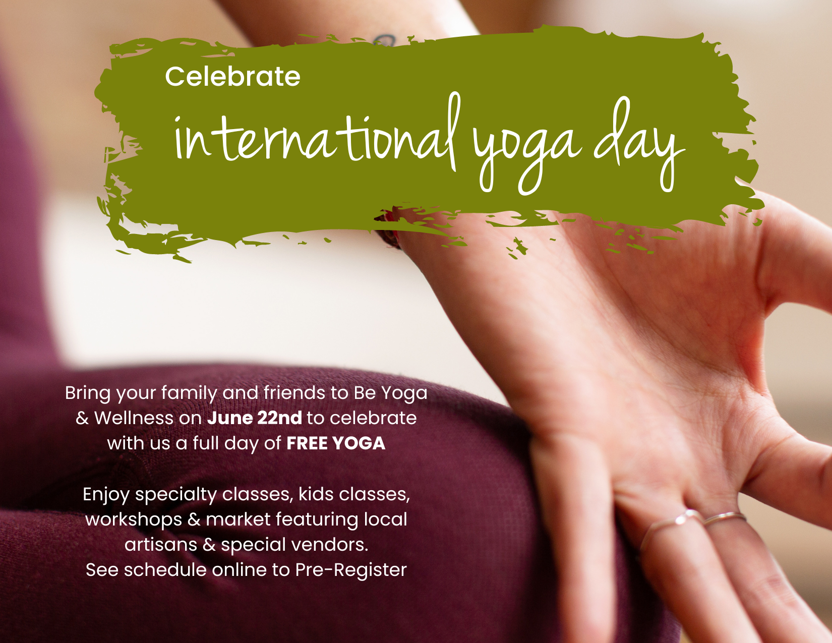 Bring your family and friends to Be Yoga & Wellness on June 22nd to celebrate with us for Yoga International Day with a full day of FREE YOGA