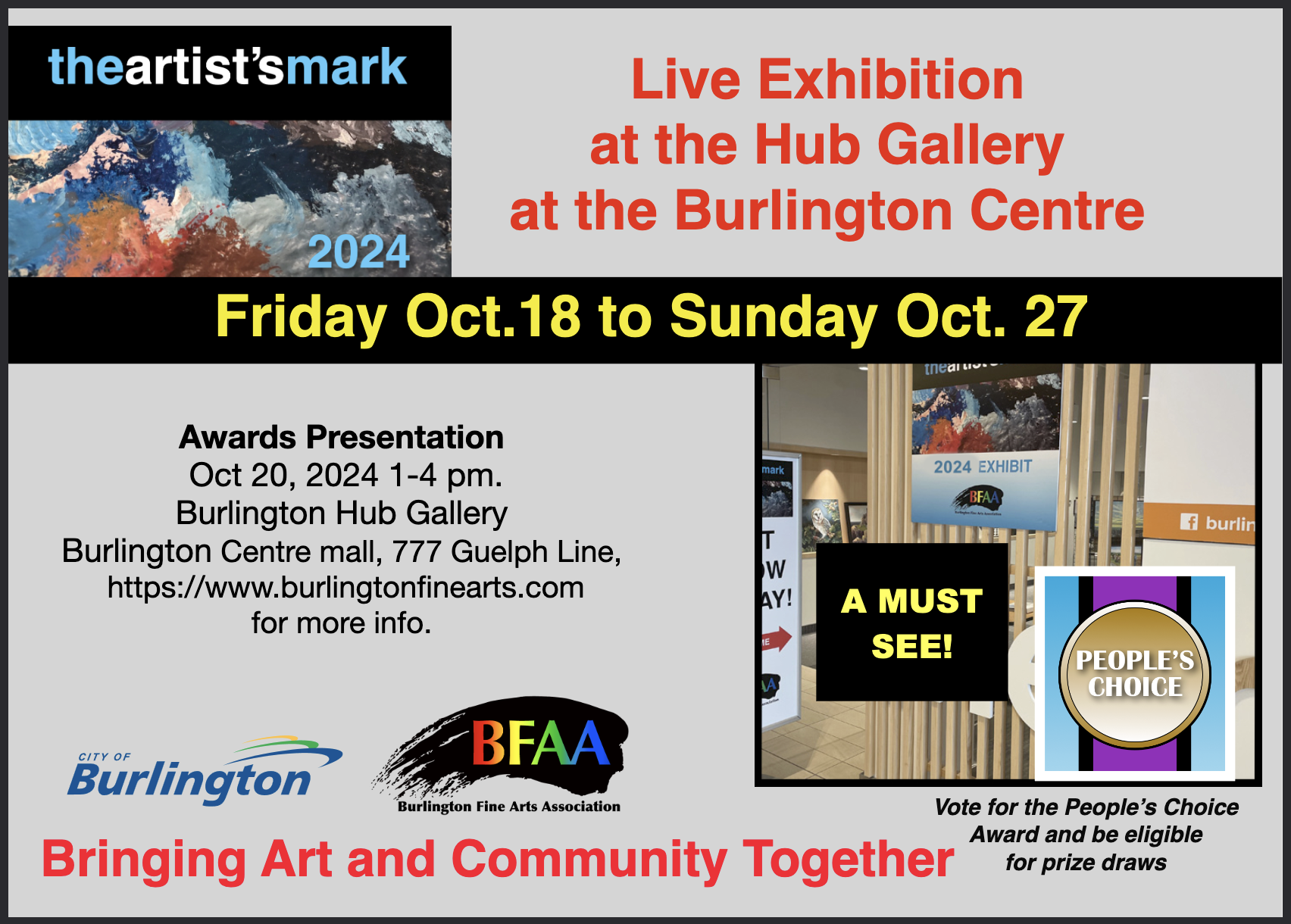 The Burlington Fine Art Association's Annual Juried show.  the Artist's Mark celebrates the high calibre of local art and artists of the Burlington community.  Chosen by professional jurors Rayne Tunley and Sam Paonessa, this year's show of original art promises to be another wonderful exhibit.  The free show runs from October 18 until October 27, 2024 where youi will have an opportunity to see the art firsthand and meet the local artists involved.  Our exciting awards ceremont will be held on October 20, 1-4 P.M. at The Hub, located at the Burlington Centre malll.  For more information see;  https://www.burlingtonfinearts.com/the-artists-mark.html
