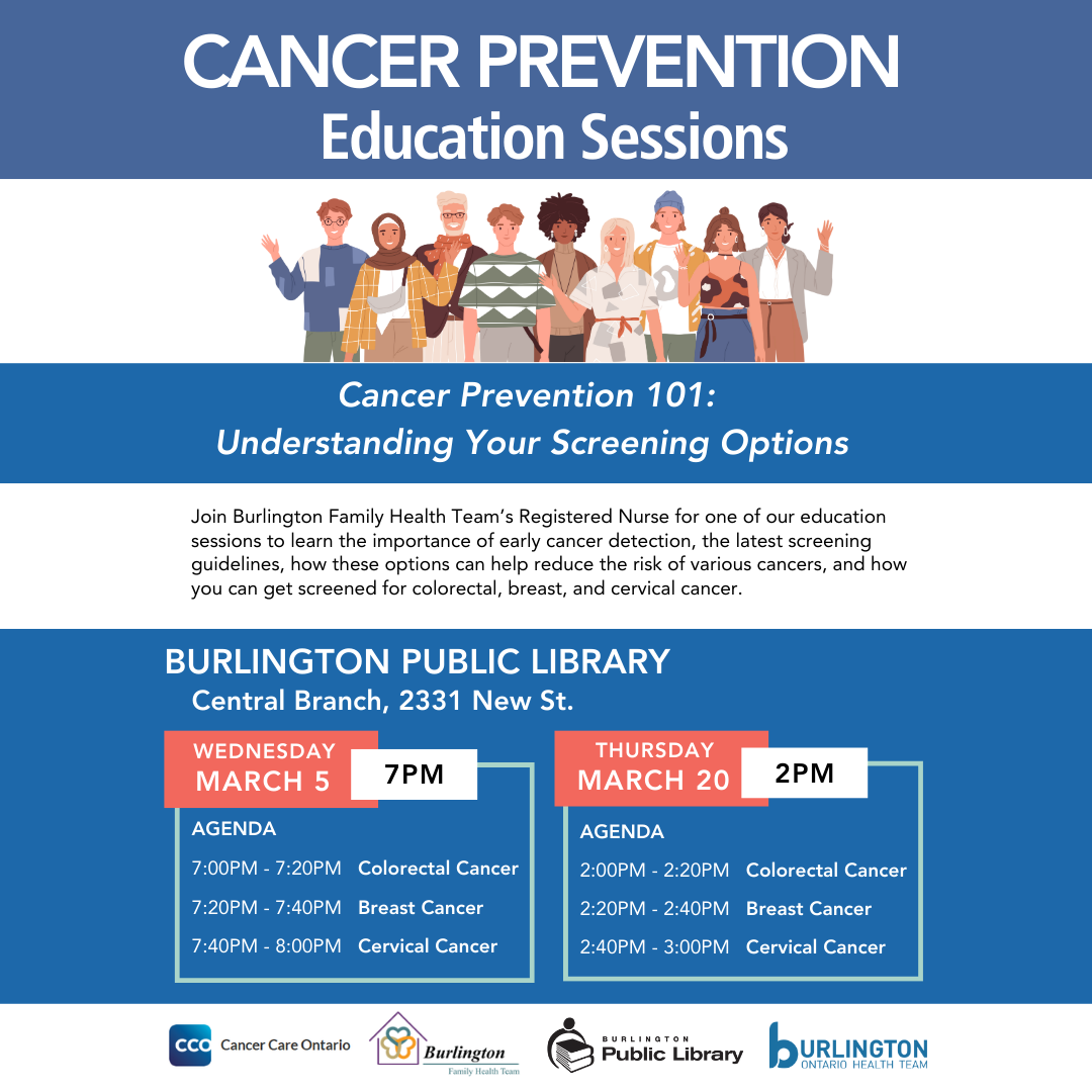 Cancer Prevention 101: Understanding Your Screening Options was developed in partnership with the Burlington Family Health Team, Cancer Care Ontario, Burlington Public Library and the Burlington Ontario Health Team.