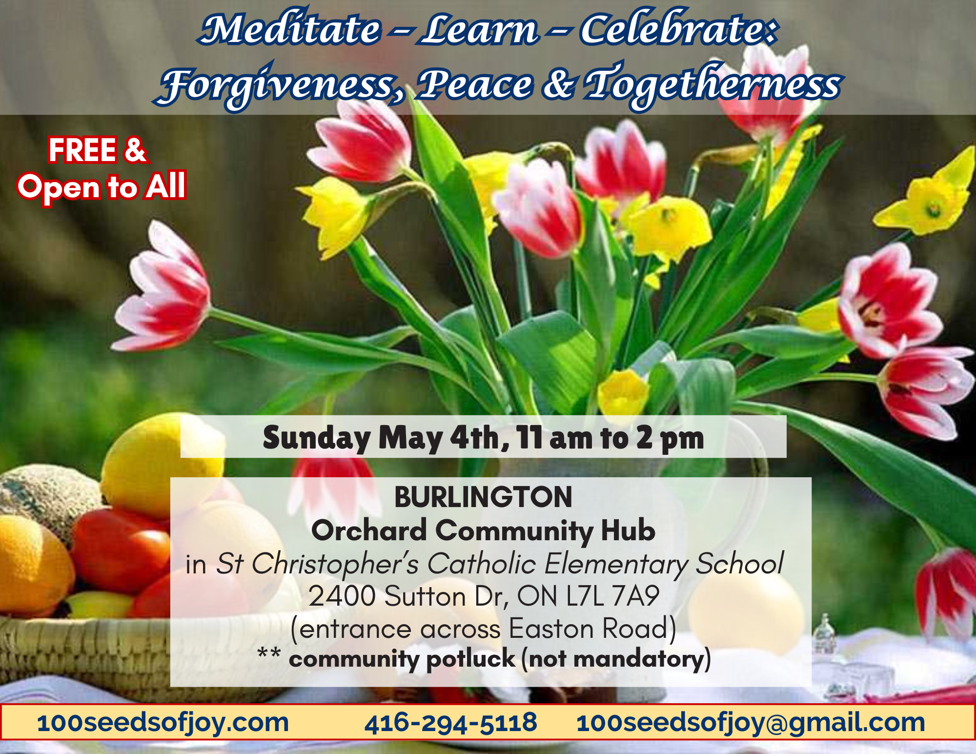 Location: Orchard Community Hub, 2400 Sutton Dr., Burlington, ON L7L 7A9 in St Christopher’s Catholic Elementary School, entrance across Easton Road.
