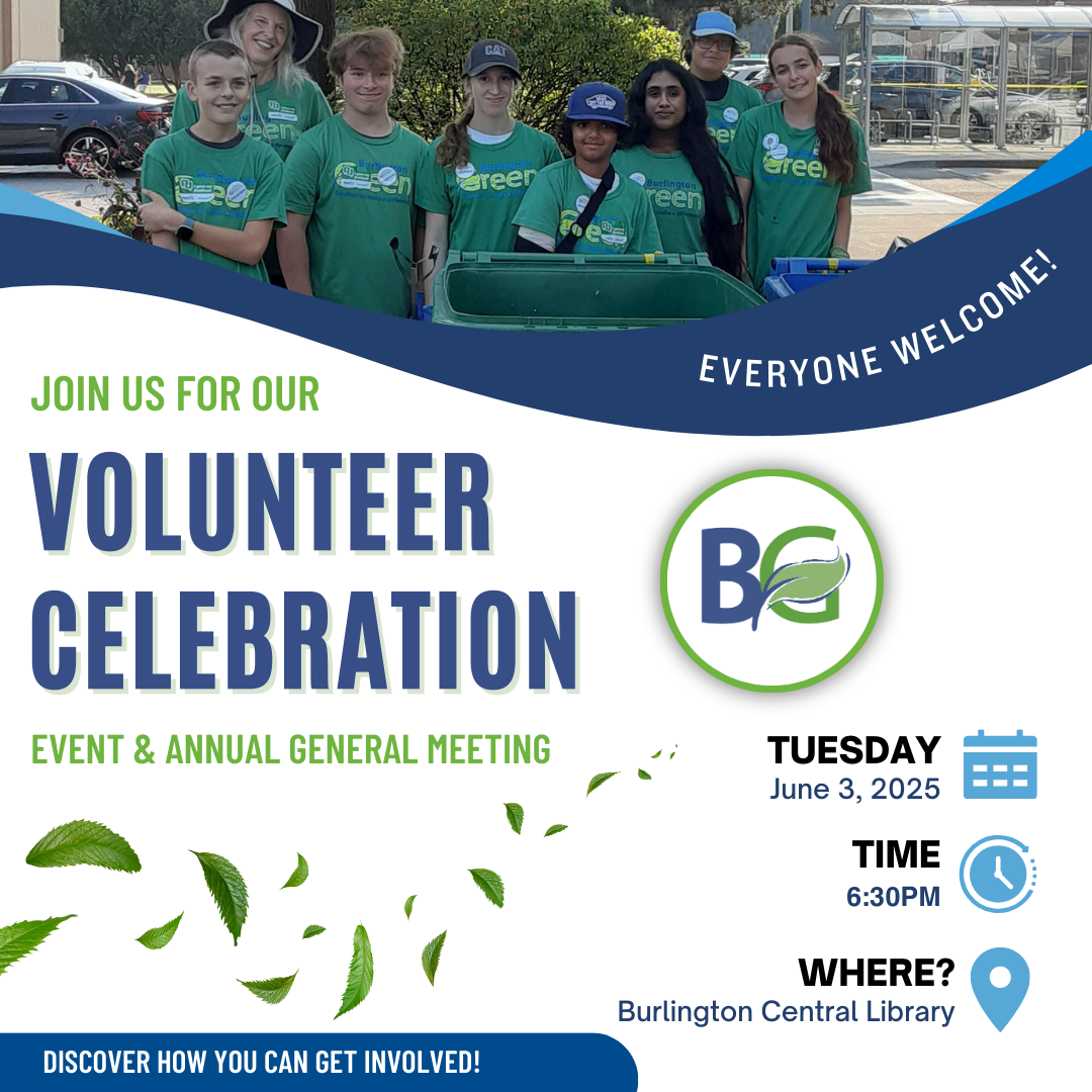 Complimentary refreshments. Get the details and rsvp: https://www.burlingtongreen.org/events/volunteer-celebration-agm/