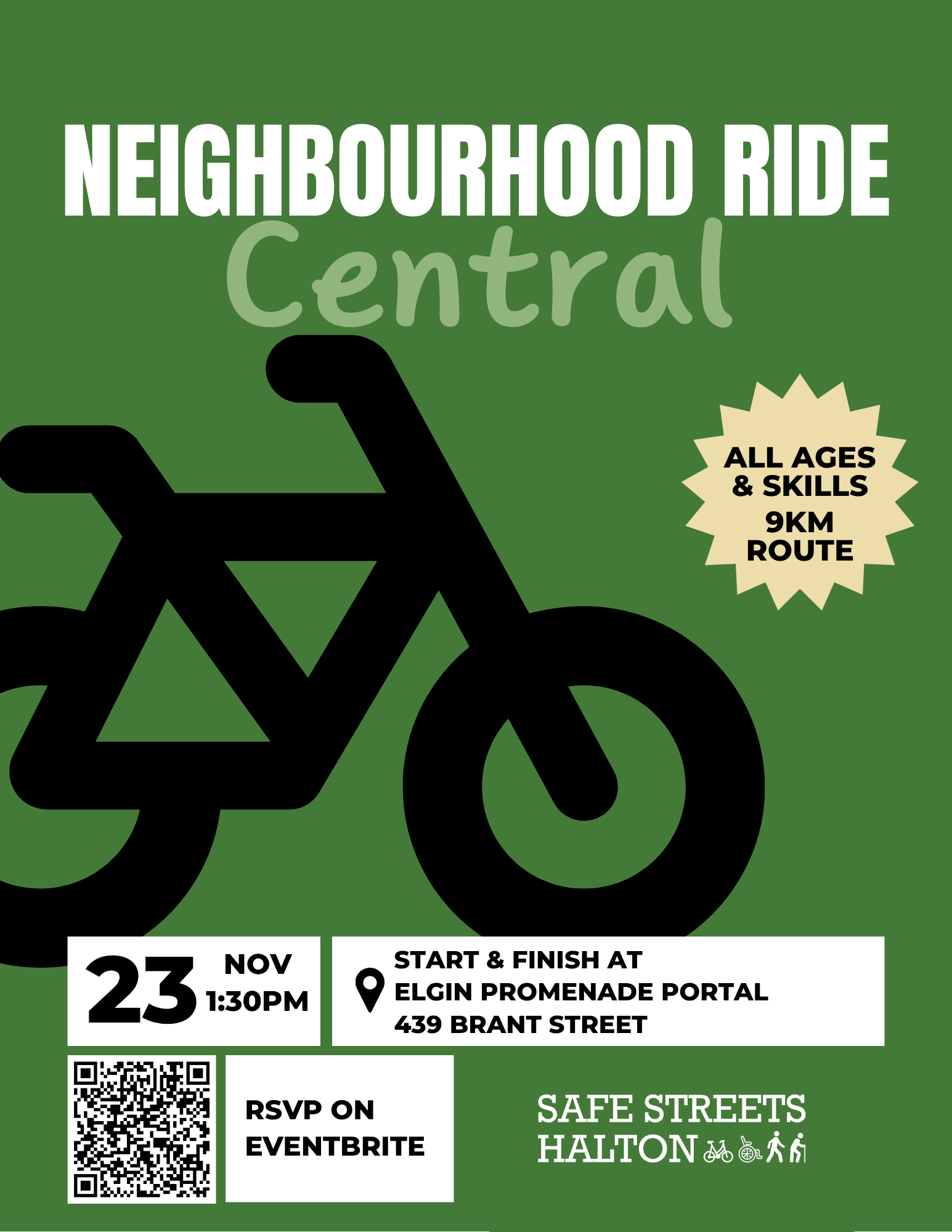 On Nov 23rd, join Safe Streets Halton for a relaxing all-ages bike ride! We'll be riding around the Central Burlington, starting at the community hub with stops at local businesses for refreshments.