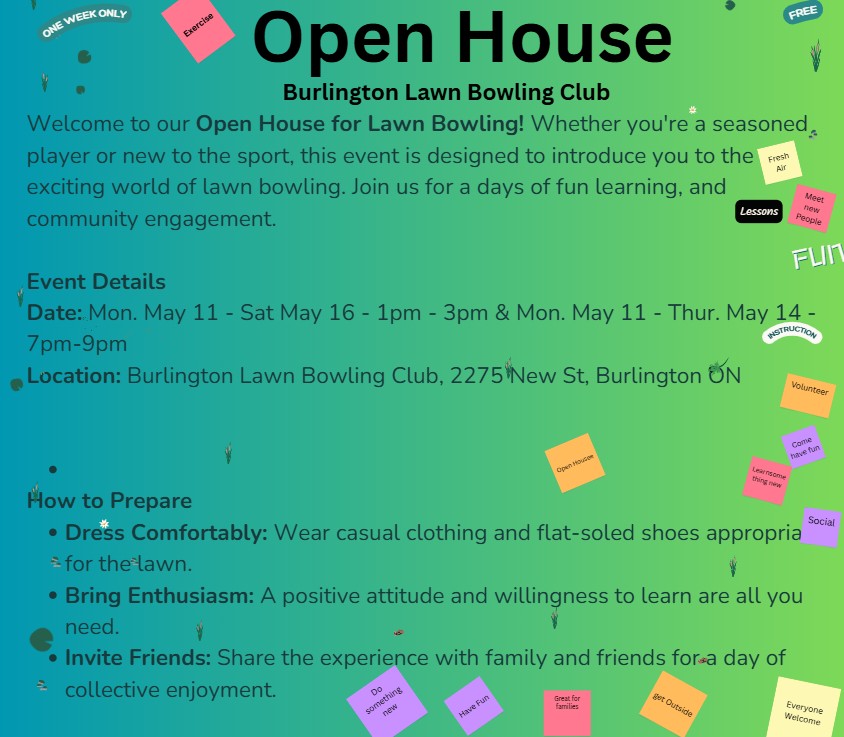 The Burlington Lawn Bowling Club has its open house events scheduled for May 2026, coinciding with the start of the outdoor season.
